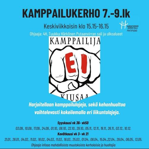 Ke 15.15 - 16.15 Kamppailukerho (7. - 9. lk), HSM-kerho, 4H-ohjaa. Alkaa 3.9.
