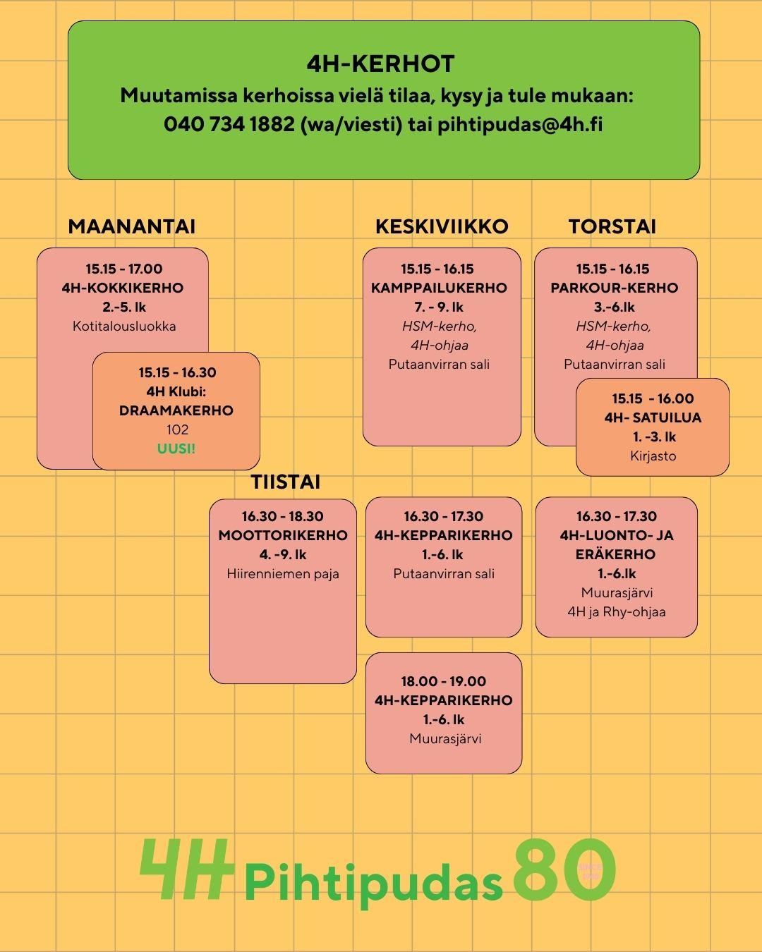Muista seurata myös Pihtiputaan 4H-yhdistyksen somea facebookissa, instagramissa ja TikTokissa, Kotiseudun sanomia, kauppojen, koulujen ja kirjaston ilmoitustauluja sekä wilmaa, sillä tiedotamme myös näiden tiedotuskanavien kautta.